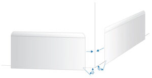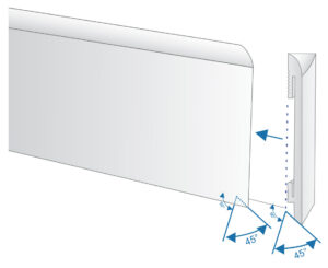 Om de plint aan de zichtbare zijde esthetisch af te werken, zaagt u het uiteinde van het profiel en de plint zelf in een hoek van 45 graden, zoals aangegeven in de onderstaande tekening. Lijm het zo ontstane uiteinde met Indesign Fix Pro lijm aan de plint.