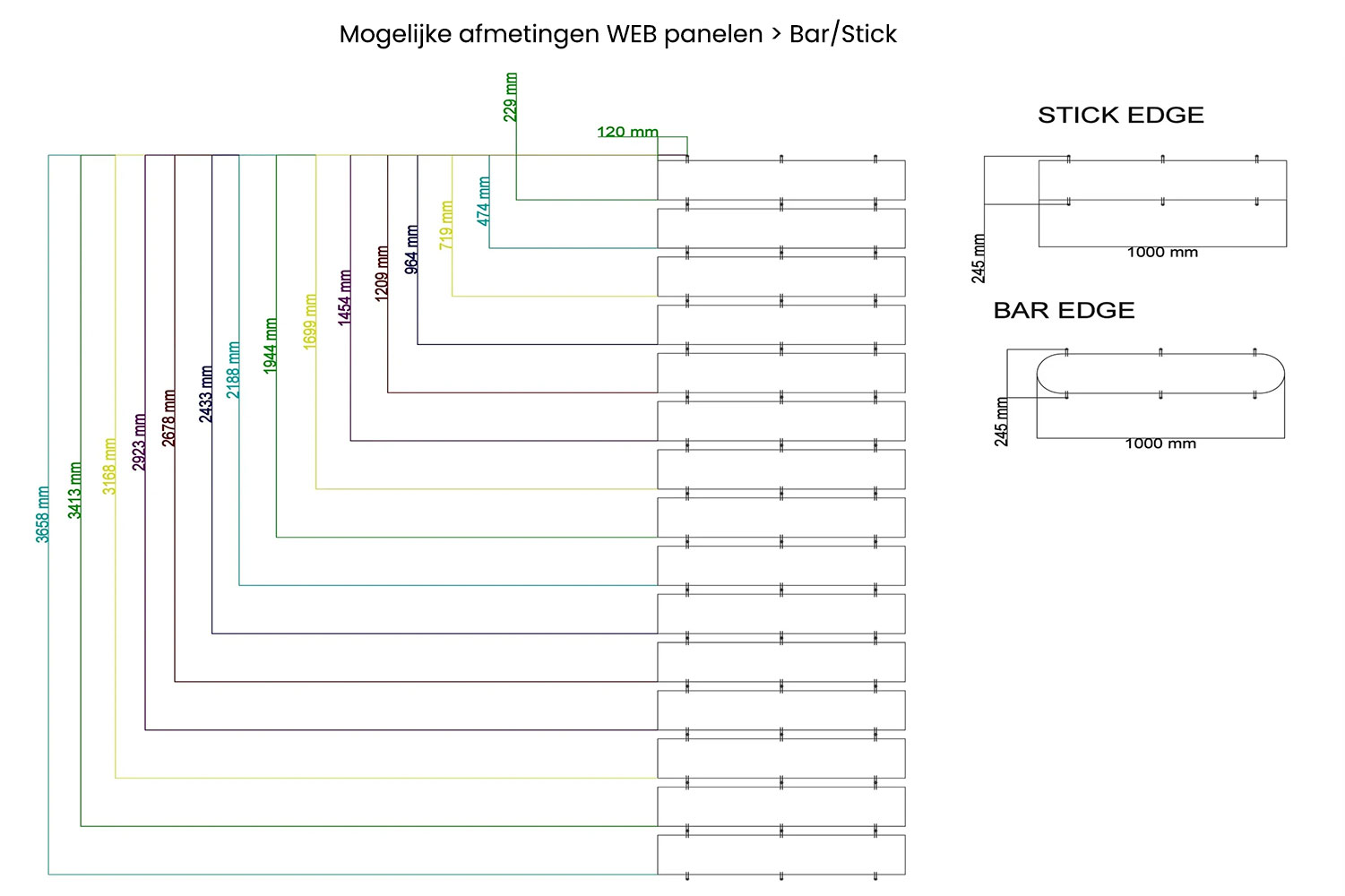 In onderstaand schema kunt u de mogelijke afmetingen van de Fluffo WEB producten zien, wat mogelijk is.