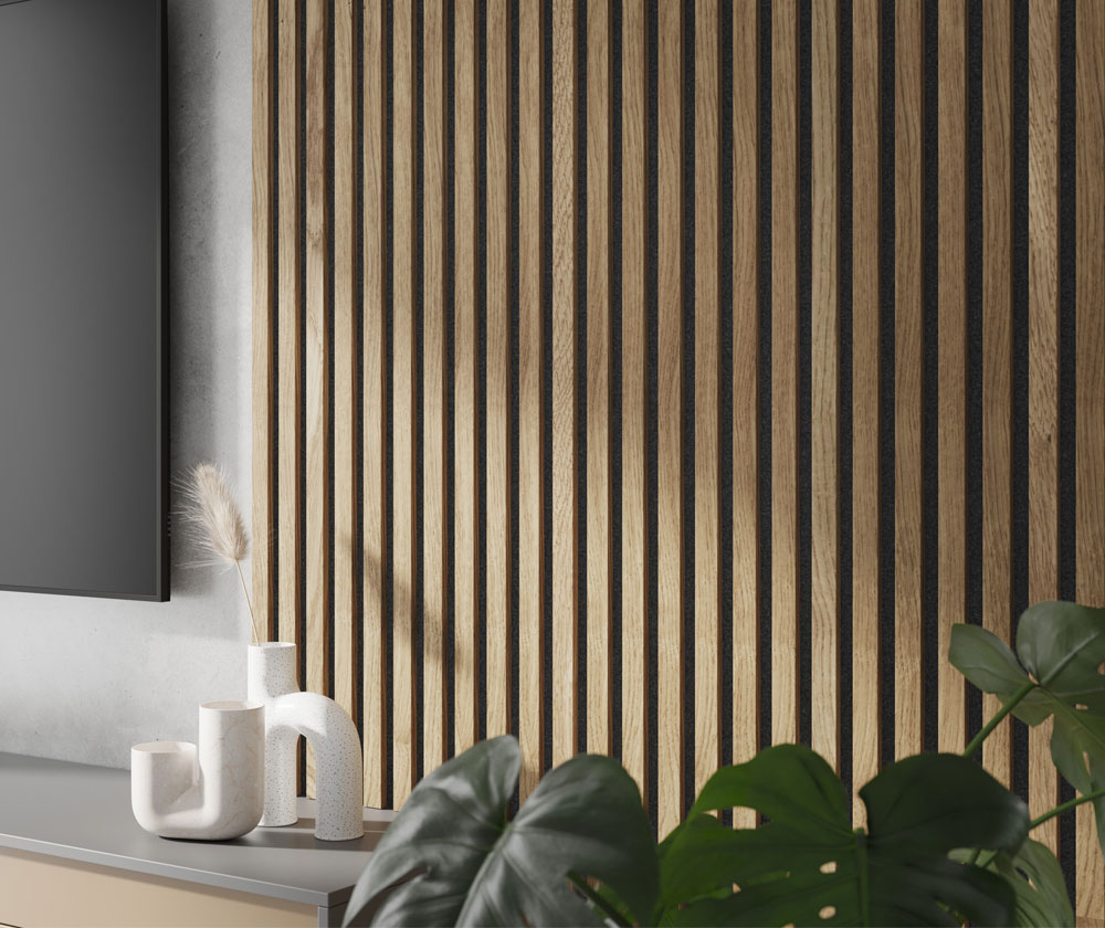 Lamellen op vilt zijn een stijlvolle decoratie die niet alleen visueel het interieur vergroten maar ook een positief effect hebben op het verspreiden van het geluid. Het is een geweldige oplossing voor woonkamers, slaapkamers en commerciële ruimtes zoals kantoren, hotels en zelfs opnamestudio’s.